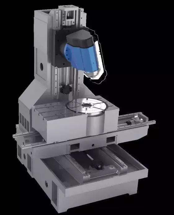 這種機型的轉臺可以做的很大,承載大重量的模具,因為工件只在XY平面做直線運動和轉動,重力對其沒有影響。但轉臺C和B擺銑頭的聯(lián)動,加上XYZ,它又是一個真五軸機,什么復雜曲面都能加工。另外旋轉工作臺只有一個C軸,制造成本跟搖籃比大幅度降低,無論是從功能,還是從力學結構、還是從精度,從制造難度上來考量,這種五軸機都應該是加工模具的完美機型。