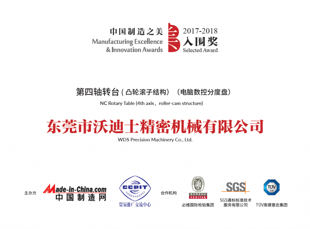 沃迪士參賽產(chǎn)品(第四軸轉(zhuǎn)臺(tái) (凸輪滾子結(jié)構(gòu))(電腦數(shù)控分度盤))經(jīng)過初評(píng)、終評(píng)兩輪評(píng)選,從中國制造之美2017屆13個(gè)參賽組別4309件參賽產(chǎn)品中脫穎而出,榮獲2017“中國制造之美”年度評(píng)選 工業(yè)設(shè)備及組件 類 入圍獎(jiǎng)!并將獲得由活動(dòng)主辦方中國制造網(wǎng)、貿(mào)促會(huì)貿(mào)推中心,聯(lián)合國際三大知名認(rèn)證機(jī)構(gòu)SGS、BV、 TüV南德頒發(fā)的榮譽(yù)獎(jiǎng)牌。