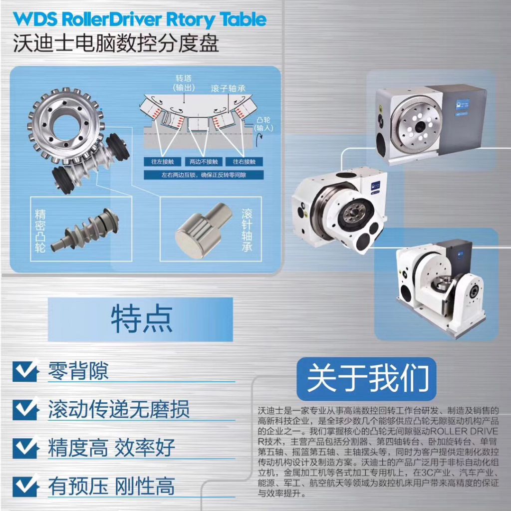 7. 2016年,沃迪士WDS成功推出成功研發(fā)單臂式及搖籃式五軸數(shù)控分度盤產(chǎn)品,與機(jī)床廠商合作開發(fā)數(shù)控?cái)[頭。